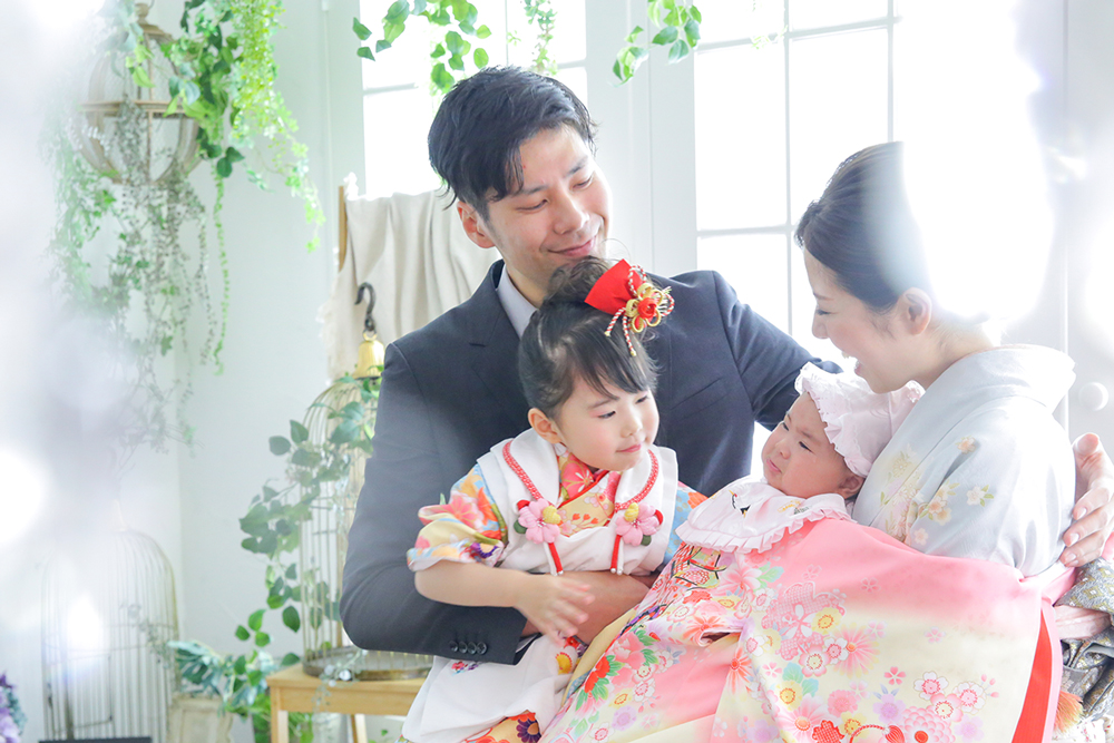 人気のパパもママも一緒にお着物を着られるオプションや、ごきょうだい様も無料で衣装が着られるのがキャラットのポイント。みんなでお祝いできるから、家族の溢れる笑顔も残せます。