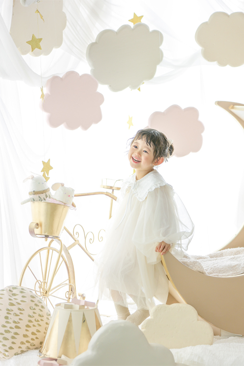 白を基調に自然素材を取り入れたリビング風のお部屋では、くつろいだ雰囲気の家族写真やバースデーフォトを。印象的なネイビー背景は上品で格好良い一枚に、七五三専用の和室は落ち着いた空間で着物が美しく映えます。月のベッドはやわらかな色合いとサーカスのような雰囲気で赤ちゃんや小さなお子さまにぴったり。グリーンベースのバースデーブースは爽やかな自然の彩りに包まれ、特別な記念日を華やかに演出します。